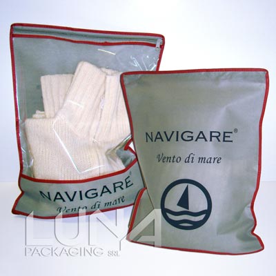 Busta sacchetto ideale per camicia-felpa-maglione. Realizzata in tessuto non tessuto tinto in pezza + pvc trasparente crystal che rende visibile il contenuto. La busta ha soffietto al fondo che ne aumenta la capienza. Tutta profilata ai bordi sempre con TNT in colore contrasto, è stampata sia sul corpo che sui soffietti con tecnica serigrafica ad 1 colore. La chiusura superiore è con zip in tessuto tono su tono.