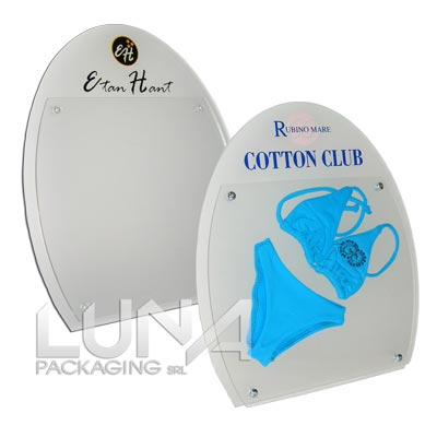 Piccolo espositore da banco autoportante realizzato in plexiglass opalino. La sua forma stondata è arricchita dalla doppia lastra in parte frontale colore Crystal tenuta con 4 piccole viti in materiale plastico che protegge e rende visibile l’articolo inserito. La schiena o parte dietro è piegata in modo da creare una base di appoggio per l’espositore stesso ed è stampata con il logo a 2 colori.